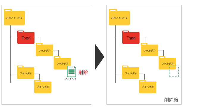 例えば、「\\192.168.1.150\共有フォルダa\フォルダ①\フォルダ②」内の「ファイルa」を削除すると、「ファイルa」は「\\192.168.1.150\共有フォルダa\Trash\フォルダ①\フォルダ②」内に移動します。