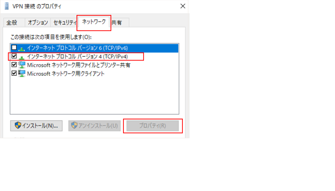 e.「VPNのプロパティ」ウインドウの「ネットワーク」タブを選択、「インターネットプロトコルバージョン(TCP/IPv6)」のチェックを外し、 「インターネットプロトコルバージョン(TCP/IPv4)」を選択して、「プロパティ(R)」ボタンをクリックします。